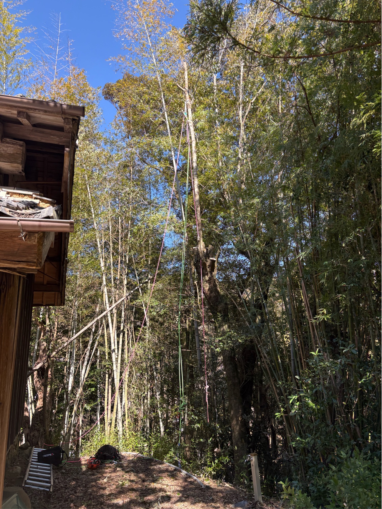 今回の現場は、すぐ横に住宅がある状況で、通常の伐倒ができないため、周囲に一切干渉しないよう細心の注意を払いながらの作業となりました。